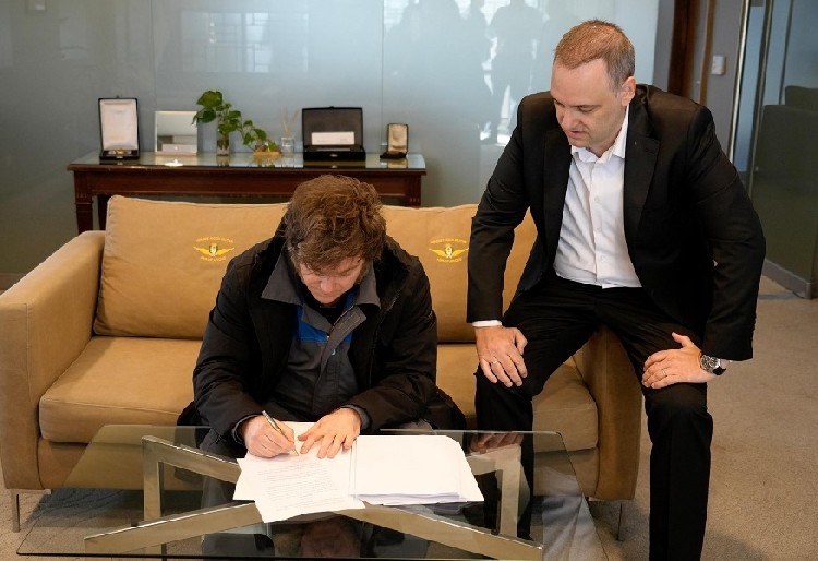 Escoltado por el jefe de Gabinete, Manuel Adorni, el Presidente rubricó el texto que ingresó este jueves por el Senado.